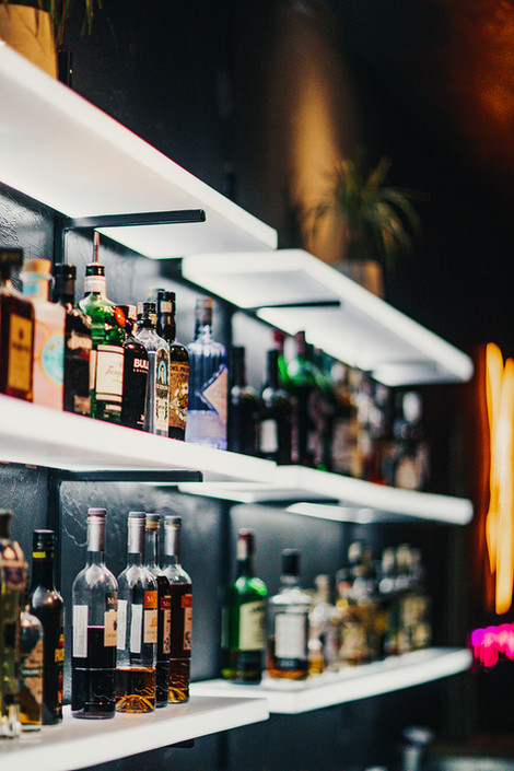 The centerpiece of the interior is our favorite, one-of-a-kind element: the fully illuminated bar counter. The light casts silhouettes of tropical plants, immediately drawing the eye and setting the mood. Complementing this, the white shelving behind the bar mimics the look of ice, creating the cool impression that the bottles are resting on a frozen surface.